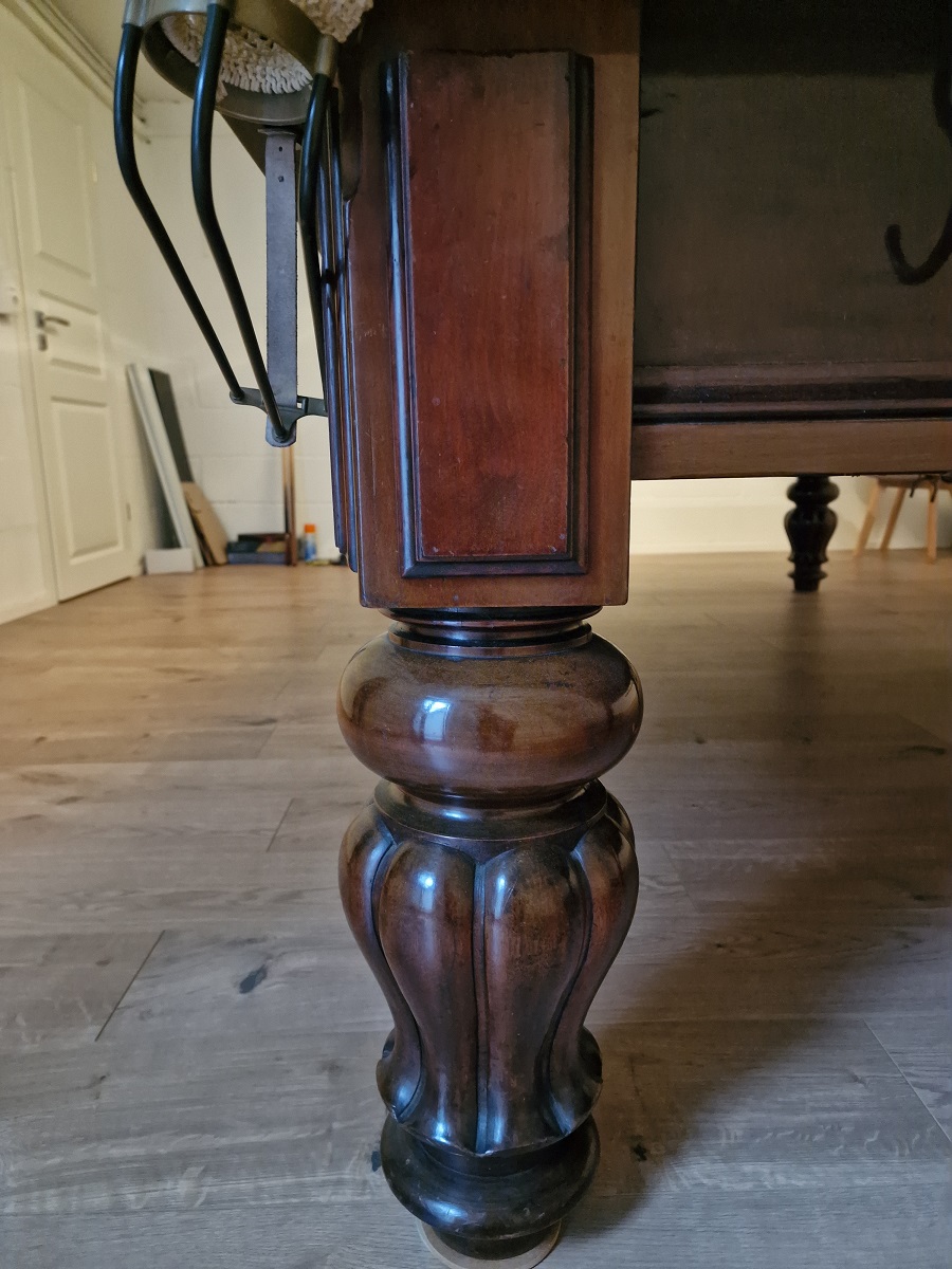 Der Tisch könnte noch älter sein, da die Taschen nicht seitlich in die Bande fixiert sondern von oben eingesetzt werden.