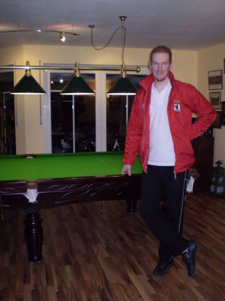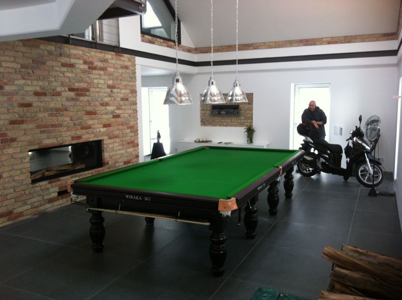 letzte Woche wurde unser 12ft. Tisch von Euch geliefert, aufgebaut und mit neuem Tuch bespannt. Den Tisch habe ich vor einigen Monaten angezahlt u. reserviert. Wir mussten erst noch den Raum dafür herrichten, eine Stütze entfernen, Unterzüge einbauen um genügend Platz zu schaffen. Es entstand ein Raum von ca. 7x7 Meter der nun ausreichend Platz für unser Hobby bietet. Sascha, der sofort nach dem Aufbau noch Richtung Münster musste, hatte noch nicht alle Banden verschraubt, da liefen auch schon die ersten Bälle übers neue Tuch. Ein Aha-Erlebnis für uns denn wir waren alte und schlecht gespannte Tücher gewohnt. Die folgenden Tage verbrachten mein Sohn und ich dem zu Folge hauptsächlich im Snooker-Raum. Fantastisch wie exakt der 80 Jahre alte Riley Tisch ausgerichtet ist und wie die Bälle laufen. Wenn Sascha wieder in unserer Gegend zu tun hat möchte er sich bitte für eine Trainingssession bei uns melden damit unser Spiel diesem tollen Tisch gerecht wird.