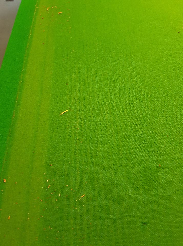 GANZ WICHTIG: immer die Laufrichtung des Tuches beachten! Das bedeutet immer die Bewegung mit dem Strich machen, also von "Gelb zu Schwarz". So gerade wie möglich die Bürste schwingen. Sonst stellen sie die feinen Haare des Tuches auf und das kann die Laufwege der Kugeln beeinflussen und sie werden langsamer als normal. Das gilt auch für die Banden!